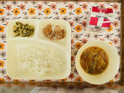 6/7の給食は「けいにくのしょうゆバターやき、みそ汁、やさいいため、ごはん、牛乳」でした。