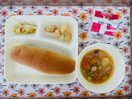 6/8の給食は「いかてんぷら、フレッシュトマトのスープに、キャベツとコーンのソテー、こくとうパン、牛乳」でした。