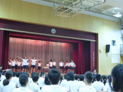 9月24日(木)連休明けは、あいにくの雨となりました。児童集会では、応援団が舞台に立って、全校で応援の練習をしました。