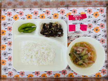 6/14の給食は「チンジャオニューロウスー、ハムと野菜のちゅうかスープ、えだまめ、ごはん、牛乳」でした。