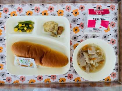 ?6/15の給食は「けいにくのカレーふうみやき、てぼまめのスープ、さんどまめとコーンのサラダ、コッペパン、アプリコットジャム、牛乳」でした。
