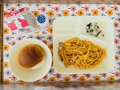 7/4の給食は「チキントマトスパゲッティ、キャベツのひじきドレッシング、発酵乳、ごはん、牛乳」です。