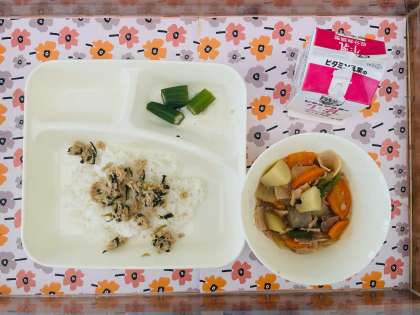 7/5の給食は「ぶたにくとじゃがいものにもの、オクラのうめふうみ、ツナっぱいため、ごはん、牛乳」でした。