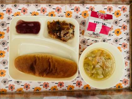 7/6の給食は「なすのミートグラタン、スープ、ダイスゼリー(ぶどう)、こくとうパン、牛乳」でした。
