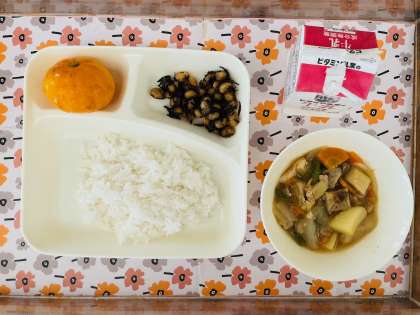 7/10の給食は「けいにくと野菜のにもの、ひじきまめ、みかん(れいとう)、ごはん、牛乳」でした。
