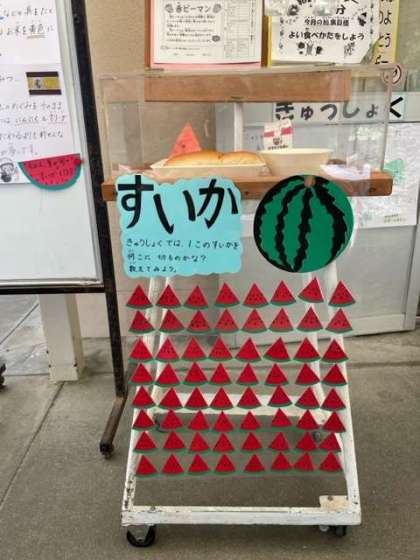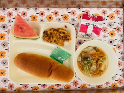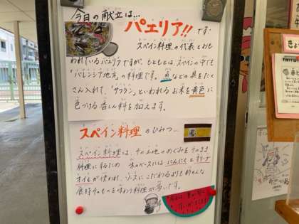 7/11の給食は「パエリア、ウインナーとキャベツのスープ、すいか、コッペパン、りんごジャム」でした。