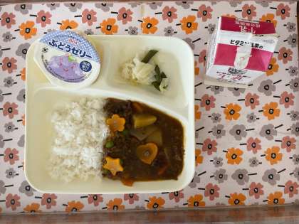 8/30の給食は「ビーフカレーライス【こめこ】、やさいのピクルス、ぶどうゼリー、牛乳」でした。