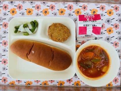 9/8の給食は「チキンレバーカツ、ケチャップに、グリーンアスパラガスとキャベツのサラダ、こうとうパン、牛乳」でした。