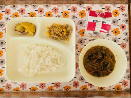 9/22の給食は「マーボーなす、ツナとやさいのいためもの、焼きさつまいものあまみつかけ、ごはん、牛乳」でした。
