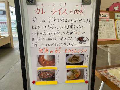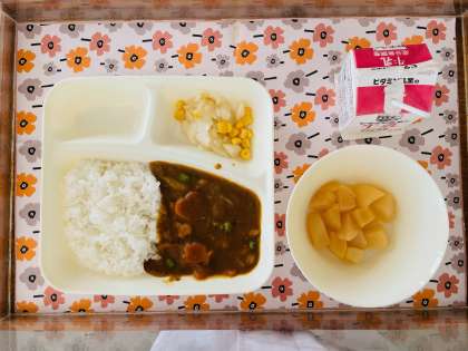 9/29の給食は「チキンカレーライス【こめこ】、キャベツとコーンのサラダ、はくとう(カット缶)、牛乳」でした。
