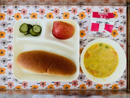 9/4の給食は「とうにゅうコーンクリームシチュー【こめこ】、きゅうりのバジルふうみサラダ、りんご、こくとうパン、牛乳」でした。