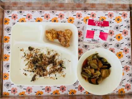 10/5の給食は「けいにくのたつたあげ、あつあげと野菜のにもの、おかかなっぱ、ごはん、牛乳」でした。