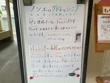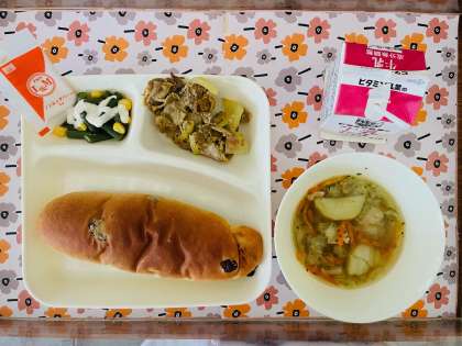10/10の給食は「ぶたにくのカレーふうみやき、けいにくと野菜のスープ、さんどまめとコーンのサラダ【ノンエッグドレッシング】、レーズンパン、牛乳」でした。