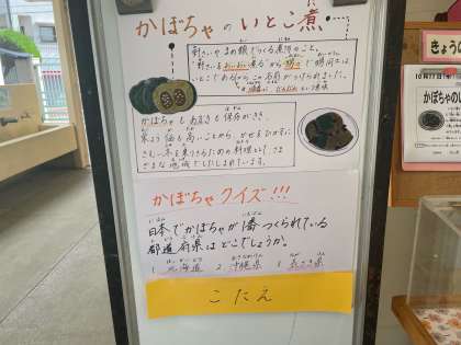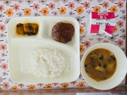10/11の給食は「わふうハンバーグ、みそしる、かぼちゃのいとこに、ごはん、牛乳」でした。