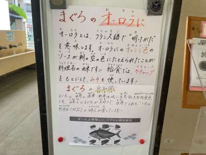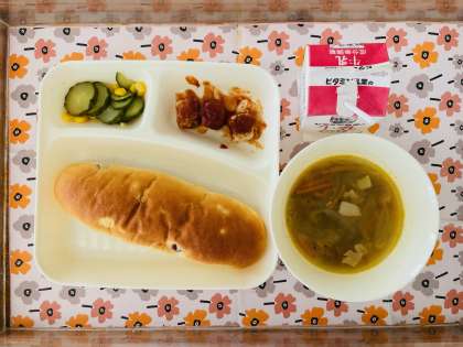 10/12の給食は「まぐろのオーロラに、スープ、きゅうりとコーンのサラダ、おさつぱん、牛乳」でした。