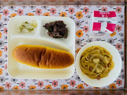 10/26の給食は「ぎゅうにくのこうみやき、ほたてがいとトマトのスープスパゲッティ、はくさいのピクルス、パンプキンパン、牛乳」でした。