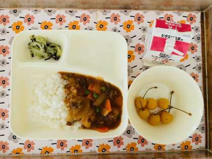 10/30の給食は「ハヤシライス【こめこ】、キャベツのひじきドレッシング、さくらんぼ(かん)、牛乳」でした。