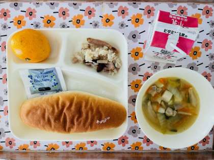 10/31の給食は「きんときまめのちゅうかおこわ、中華スープ、みかん、コッペパン、ブルーベリージャム、牛乳」でした。