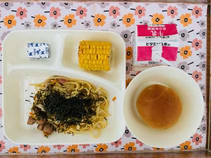 11/10の給食は「ウインナーときのこの和風スパゲッティ、焼きとうもろこし、こけいチーズ、黒とうクレセントロールパン、牛乳」でした。