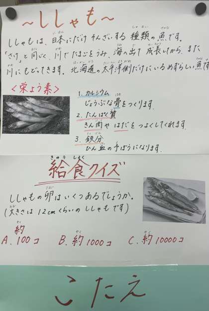 11/14の給食は「やきししゃも、みそ汁、こまつなのいためもの、ごはん、牛乳」でした。