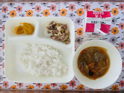 11/28の給食は「ぶたにくと野菜のいためもの、いわしのつみれ汁、かぼちゃういろう、ごはん、牛乳」でした。