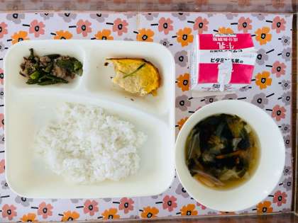 12/8の給食は「具だくさんたまごのちぐさ焼き、ごもく汁、ぶた肉とさんどまめのいためもの、ごはん、牛乳」でした。