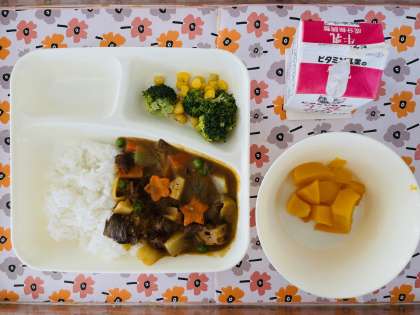 12/13の給食は「冬野菜のカレーライス、ブロッコリーとコーンのサラダ、おうとう(カット缶)、牛乳」でした。