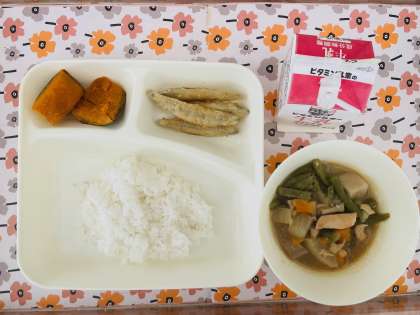 12/19の給食は「きびなごてんぷら、ふくめ煮、焼きかぼちゃのあまみつかけ、ごはん、牛乳」でした。