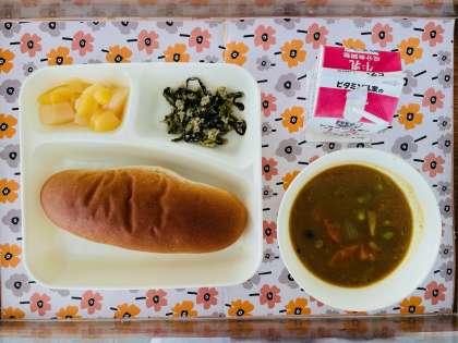 1/12の給食は「ミートボールと野菜のカレー煮、ツナとこまつなのソテー、白桃(カット缶)、黒とうパン」でした。