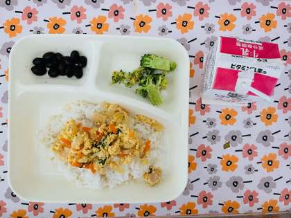 1/18の給食は「親子どんぶり、ブロッコリーのごまあえ、黒豆のにもの、牛乳」でした。