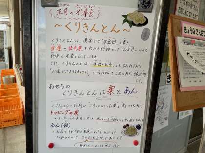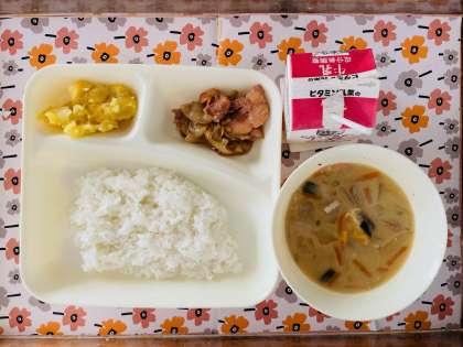 1/24の給食は「けい肉の甘辛やき、かす汁、くりきんとん、ごはん、牛乳」でした。