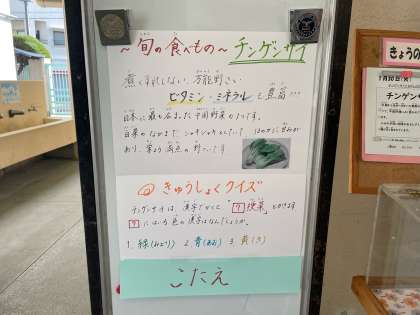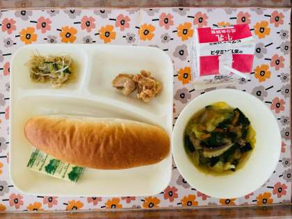 1/30の給食は「けい肉のからあげ、中華スープ、チンゲンサイともやしのあまずあえ、コッペパン、ソフトマーガリン、牛乳」でした。
