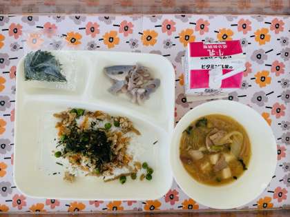 2/2の給食は「とりごぼうごはん、みそ汁、焼きれんこん、牛乳」でした。