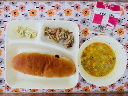 2/21の給食は「ぶた肉のカレーふうみ、コーンとはくさいのスープ、カリフラワーのレモンドレッシング、レーズンパン、牛乳」でした。
