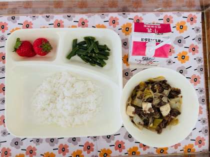 2/22の給食は「すきやきに、さんどまめのごまあえ、いちご、ごはん、牛乳」でした。