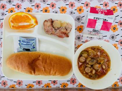 3/12の給食は「けい肉とじゃがいものガーリック焼き、ウインナーとてぼ豆のスープ、デコポン、ブルーベリージャム、コッペパン、牛乳」でした。