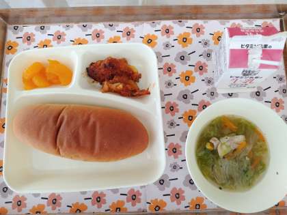 4/18の給食は「じゃがいものミートグラタン、レタスのスープ、みかん(缶)、牛乳、黒糖パン」です。