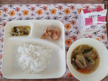 4/19の給食は「鶏肉のからあげ、中華スープ、チンゲンサイともやしの甘酢あえ、ごはん、牛乳」です。