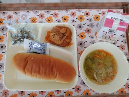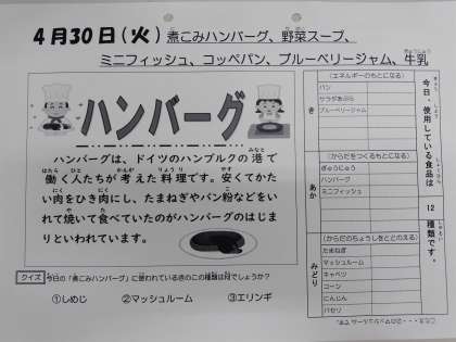 4/30の給食は、「煮こみハンバーグ、野菜スープ、ミニフィッシュ、コッペパン、ブルーベリージャム、牛乳」です。ハンバーグは、よく煮こみ、味がしっかりつくようにしています。