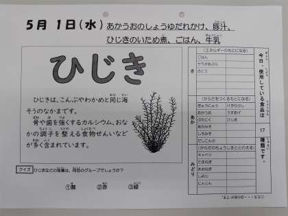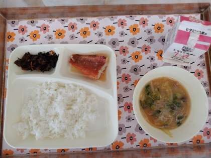 5/1の給食は「あかうおのしょうゆだれかけ、豚汁、ひじきのいため煮、ご飯、牛乳」です。あかうおは、骨が少なく、食べやすく、児童にも人気の献立です。