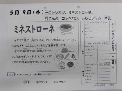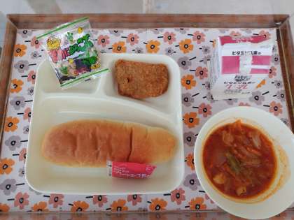 5/9の給食は「一口トンカツ、ミネストローネ、豆こんぶ、コッペパン、いちごジャム、牛乳」です。