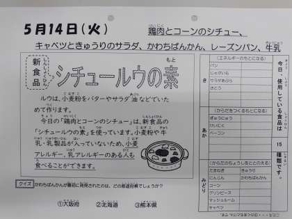5/14の給食は「鶏肉とコーンのシチュー、キャベツときゅうりのサラダ、かわちばんかん、レーズンパン、牛乳」です。
