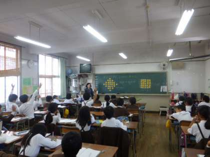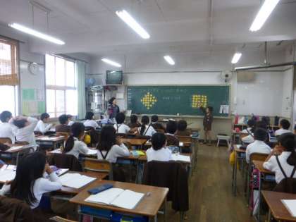 11月11日(水)今朝もよいお天気に恵まれました。余り寒くなく、まずまずの気候です。4年生は、算数の時間におはじきの数を計算して、「求め方を考え、一つの式を表そう」という学習をしました。子どもたちは、いろいろな考え方と式を発表していました。