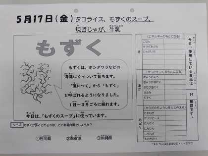 5/17の給食は「タコライス、もずくのスープ、焼きじゃが、牛乳」です。