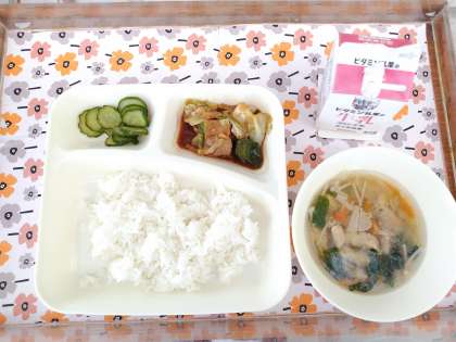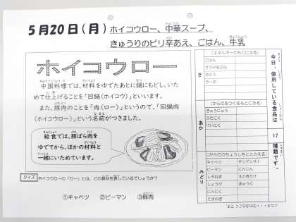 5/20の給食は「ホイコウロー、中華スープ、きゅうりのピリ辛あえ、ごはん、牛乳」です。