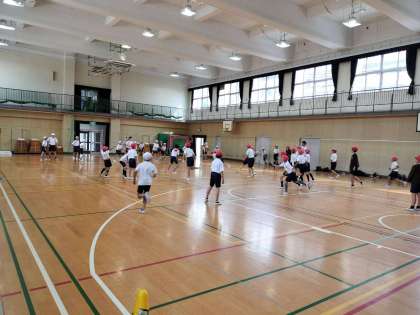 次回からは運動場チームと体育館チームに分かれて活動していくので、初回の今日は全員でドッジボールをして、交流しました。