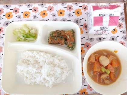 5/24の給食は「ちくわのいそべあげ、あつあげとさといものみそ煮、あっさりキャベツ、ご飯、牛乳」です。