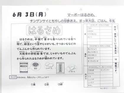 6/3の給食は「マーボーはるさめ、チンゲンサイともやしの甘酢あえ、まっ茶大豆、ごはん、牛乳」です。