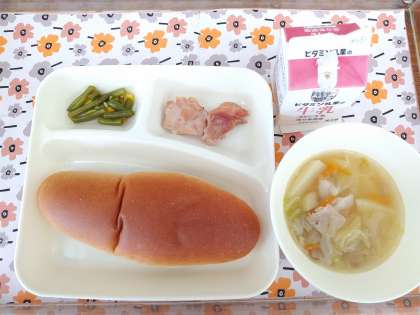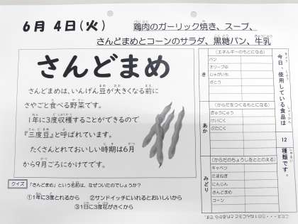 6/4の給食は「鶏肉のガーリック焼き、スープ、さんどまめとコーンのサラダ、黒糖パン、牛乳」です。