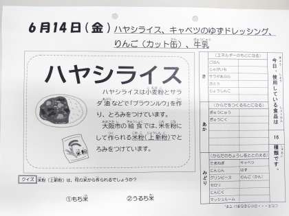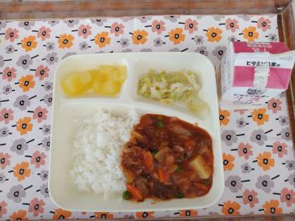 6/14の給食は「ハヤシライス、キャベツのゆずドレッシング、りんご(カット缶)、牛乳」です。